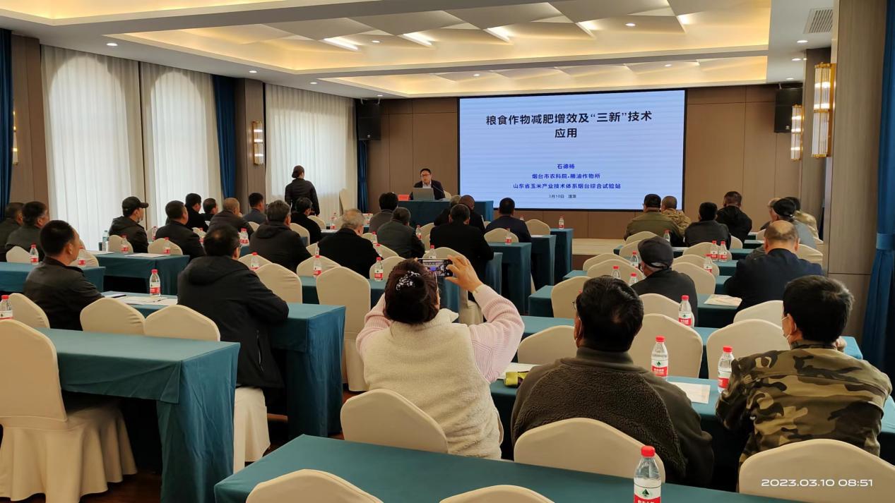 2023年3月10日,山东省玉米产业技术体系烟台综合试验站站长夏德君及团队成员石德杨博士应蓬莱区农技推广中心邀请对全区50亩以上的种粮大户进行了《粮食作物减肥增效及“三新”技术应用》培训。石德杨博士为种植大户介绍了我国粮食生产及化肥使用情况以及化肥减量增效的现实意义,重点对化肥减量增效的“三新”技术(养分管理新技术、施肥新方式、肥料新产品)的应用进行讲解,并与种粮大户进行互动交流。
