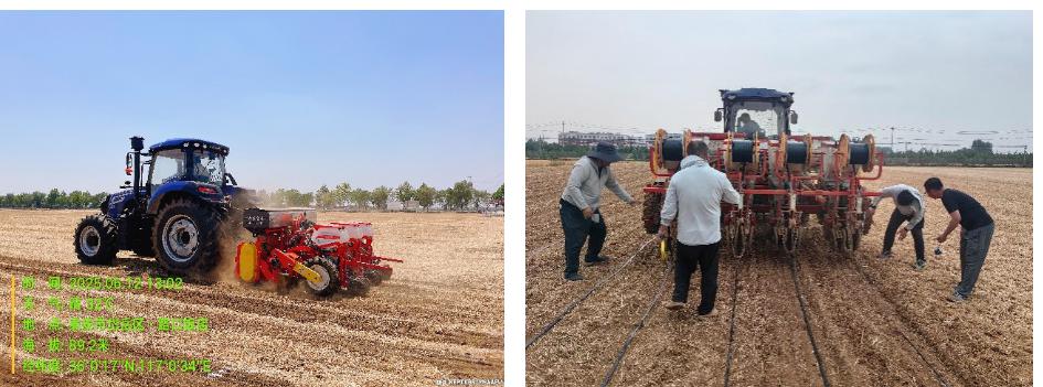 8.省玉米体系岗站协同,助力小麦玉米周年“吨半粮”示范区建设。为贯彻落实国家“新一轮千亿斤粮食产能提升行动”和山东省“建设更高水平齐鲁粮仓”要求,2025年 6月12日至19日,省玉米产业技术体系岗位专家李宗新研究员组织团队联合德州试验站、泰安岱岳试验站、平邑天泰试验站及主产市县农业部门,开展岗站协同,助力小麦玉米周年“吨半粮”示范区建设。体系骨干与省农机院专家先后赴泰安市岱岳区、德州市齐河县、济南市章丘区、淄博市桓台县、滨州市博兴县等地,累计完成“吨半粮”攻关田夏玉米播种300余亩,推广了夏玉米清茬三角精准定位密植播种、水肥一体化等关键技术及优良玉米新品种。通过提高播种质量、密度及群体整齐度,改传统施肥为滴灌水肥一体化分次追施,以“三提一改”助推玉米单产提升。
