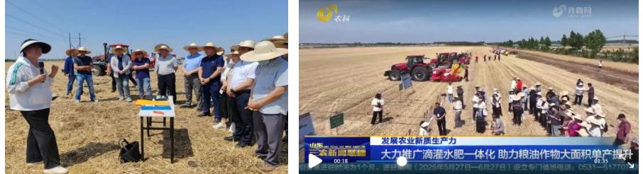 5.体系岗位专家姜雯教授先后赴青岛、烟台参加滴灌水肥一体化技术田间培训活动。为深入推进主要粮食作物大面积单产提升,体系岗位专家姜雯教授先后参加了青岛市农技中心于2025年6月10日在莱西举行的“粮食滴灌水肥一体化技术集中观摩”和烟台市农技中心于6月17日在莱州举行的“全市主要粮食作物大面积单产提升关键技术田间课堂”活动。姜雯教授在田间借助实地实物,围绕“夏玉米滴灌水肥一体化技术要点和田间管道布设示范”进行了专题授课和实操指导,通过视频号进行了现场直播,并与参会人员进行了互动,现场学习氛围浓厚,讨论热烈。发展农业新质生产力,大力推广滴灌水肥一体化,将助力实现规模化粮油作物大面积单产提升。