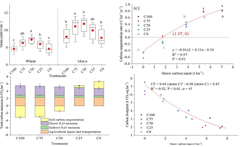 【研究进展】 体系在小麦-玉米周年高产与绿色低碳协同领域取得重要研究进展。体系岗位专家李宗新研究员团队研究成果“Optimizing straw return to enhance grain production and approach carbon neutrality in the intensive cropping systems”近期发表于国际期刊Soil Tillage & Research (中科院1区Top,IF5y=6.9)。当前,如何在保证粮食作物高产的同时实现绿色低碳,已成为保障粮食安全和推动农业绿色生态发展的关键。该研究针对小麦-玉米一年两熟集约高产种植制度中长期密集且过量的秸秆还田引发有机碳固存速率下降、播种质量差、作物群体整齐度不高以及病虫害频发等诸多问题,借助定位试验深入探究了华北平原小麦玉米周年集约化种植制度下秸秆还田量在平衡作物生产力和碳中和方面的作用机理,揭示了优化秸秆管理能够协同提升作物周年产量与土壤固碳减排潜力,明确减量50%秸秆还田可实现麦玉周年产量提高15%与固碳减排 4.3 t CO2-eq ha-1的双赢。上述科学问题的阐释为小麦玉米周年高产、粮田土壤质量提升和碳中和提供了理论依据,也为推动华北平原小麦玉米周年集约化系统绿色可持续发展提供了重要的实践选择。