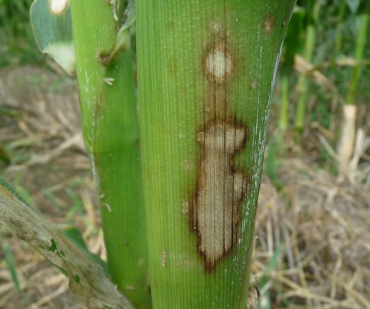 鞘腐病是近年来,我国玉米产区发生的一种新病害,它是由多种病原菌单独或者复合侵染引起的叶鞘腐烂病的一种总称。 一、症状 典型症状是发病初期在叶鞘部出现水渍状椭圆形或褐色小点,后逐渐扩展,多个病斑汇合形成黑褐色不规则形斑块,蔓延至整个叶鞘,致叶鞘干腐或湿腐。在潮湿的环境中,病部出现白色、粉色、灰褐色或者紫红色等霉层。