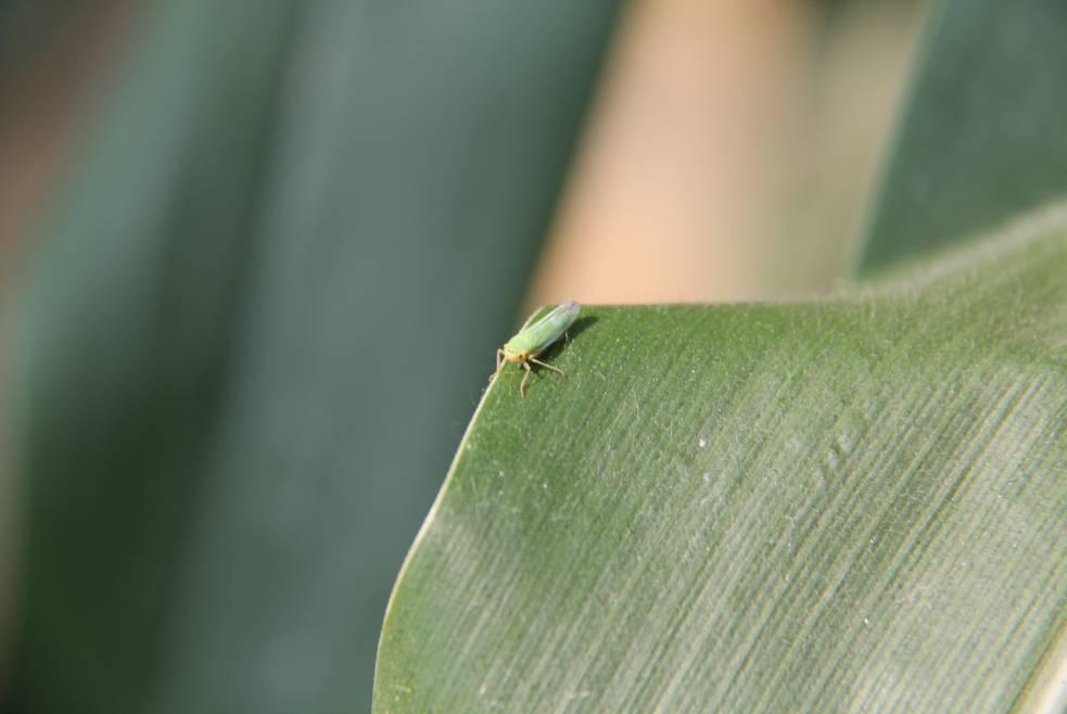 大青叶蝉Cicadella viridis(L.)为同翅目、叶蝉科。别名青叶蝉、大绿浮尘子等。分布全国各地。 1、危害特点 成虫与若虫在玉米茎秆和叶片上吸食危害,一般从下部叶片逐渐向上扩散,刺吸叶片汁液,造成失绿斑点。 2、形态特征 成虫 雌虫体长9.4~10.1mm,雄虫体长7.2~8.3mm,青绿色。头橙黄色,左右各具1小黑斑;单眼2个,红色,单眼间有2个多角形黑斑。前胸背板淡黄绿色,后半部深青绿色。前翅绿色带有青蓝色泽,前缘淡白,端部透明,翅脉为青黄色,具狭窄的淡黑色边缘,前翅反面、后翅和腹背均为黑色,腹部两侧和腹面橙黄色。足黄白至橙黄色。 卵 白色微黄,长卵圆形,长1.6mm,中间微弯,一端稍细,表面光滑。 若虫 与成虫相似,共5龄。初龄乳白色;2龄淡灰微带黄绿色;3龄灰黄绿色,胸腹背面有4条褐色纵纹,出现翅芽;4、5龄特征基本同3龄。