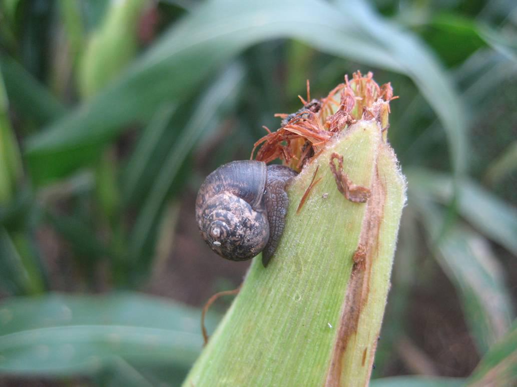 灰巴蜗牛Bradybaena ravida ravida (Benson)俗称蜒蚰螺、螺丝、水牛儿等,属软体动物门、腹足纲、柄眼目、巴蜗牛科。 1、危害特点 灰巴蜗牛危害玉米、棉花、豆类、蔬菜、三叶草等。初孵或稍大幼螺剥食玉米叶肉,留下网状斑块或成条长斑,稍大幼螺和成螺用齿舌将叶片食成孔洞或缺刻,常沿叶脉方向取食,叶片呈纤维丝状破碎。发生量大时,叶片干枯死亡。此外,还聚集在雌穗顶部取食籽粒,并排泄粪便于其上。 2、形态特征 成螺螺壳中等大小,高19~21mm、宽21~23mm,有5.5~6个螺层,呈圆球形,背面膨大,顶部尖。螺壳黄褐色至灰褐色,其上具有黑褐色不规则斑块。螺口呈椭圆形。卵圆球形,白色。