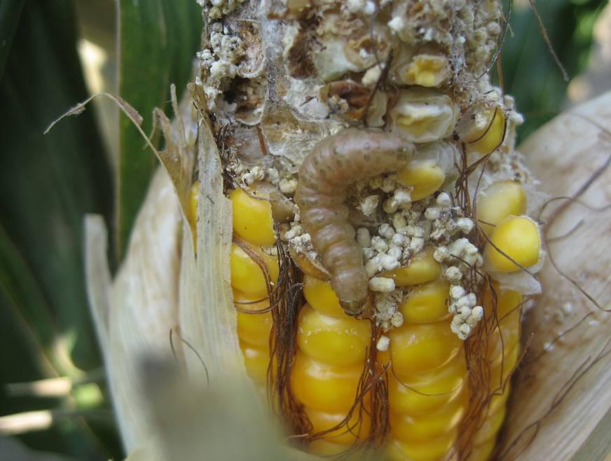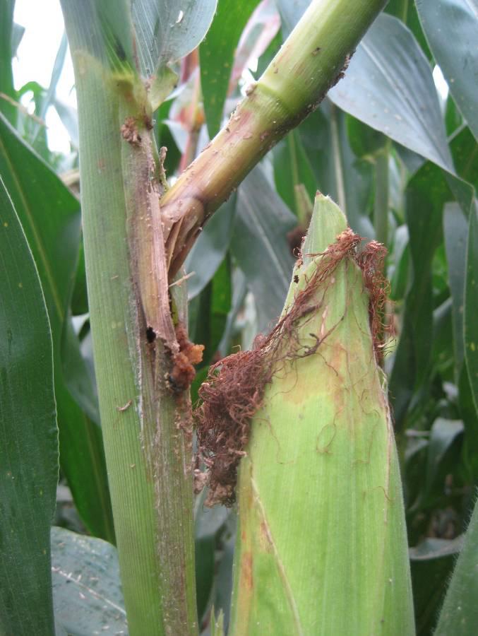 桃蛀螟幼虫危害雄穗穗柄造成“折雄” 3、发生规律 桃蛀螟在山东省一年发生2~3代,以老熟幼虫在玉米茎秆和穗轴、高粱穗轴等处越冬,果树产区在树皮裂缝中越冬。5月上中旬化蛹,5月下旬至6月中旬为越冬代成虫发生期,第一代幼虫在6月下旬至7月下旬发生,主要危害桃和春玉米。第一代成虫在7月下旬至8月上旬发生,第二代卵盛期在8月中旬,第二代幼虫在8月中旬危害玉米等作物,是重点控制的时期。9月下旬以后有的个体开始越冬,有些个体还可以发育至成虫产下后代,发生第三代。 成虫有趋光性,对糖醋酒液有较强的趋性。卵多单粒散产在雌穗上部叶片、花丝及苞叶上,以花丝上最多。 桃蛀螟喜欢高湿环境,产卵和幼虫孵化期间湿度大存活率高,发生重,反之发生轻。果树种植产区,玉米受害重。 4、防治技术 (1)农业防治 在越冬幼虫化蛹或成虫羽化之前,将高粱和玉米秸秆与穗轴及时处理(粉碎等),以减少越冬虫源。 (2)诱杀成虫 利用频振杀虫灯、性诱剂或糖醋酒液诱杀成虫。 (3)药剂防治 在玉米果穗顶部或花丝上滴50%辛硫磷乳油500倍液或20%氯虫苯甲酰胺悬浮剂2000倍液3~4滴,对蛀穗害虫防治效果好。 (4)生物防治 参考玉米螟和高粱条螟的防治方法,释放赤眼蜂或在桃蛀螟第二代卵盛期喷洒苏云金杆菌可湿性粉剂(16000 IU)1000倍液,兼治其他穗部鳞翅目害虫。 |