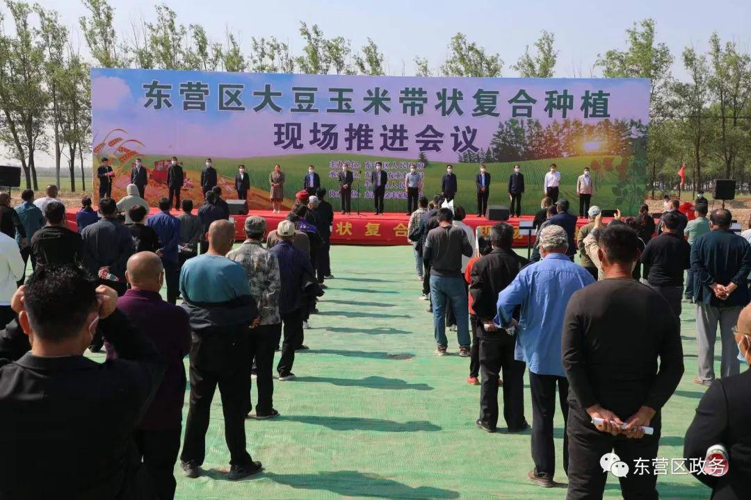 5月15日上午,东营区大豆玉米带状复合种植春播现场推进会在东营金丰农场召开。区委副书记、区长燕雪英参加会议,区委副书记胥高远主持会议。区委常委、牛庄镇党委书记李过,副区长张树卫,以及市、区、镇(街道)有关部门单位负责同志和部分种植大户代表参加会议。 山东省省体系岗位专家、山东省农业科学院玉米所副所长、研究员丁照华在致辞中表示,专家团将立足当前春播任务,围绕“玉米不减产,增收一季豆”的原则,为大豆玉米带状复合种植提供技术指导。全力做好品种筛选关、播种质量关、病虫草害防控关和机械收获等工作,稳步扩大示范面积,并积极探索其他间作套种新模式。依托金丰农场千亩示范田及百亩攻关田,进一步加大耐盐碱品种的研发、选育、推广,对新品种的适应性和种植模式进行实验研究,积极开展“卡脖子”技术攻关和成果转化示范应用。